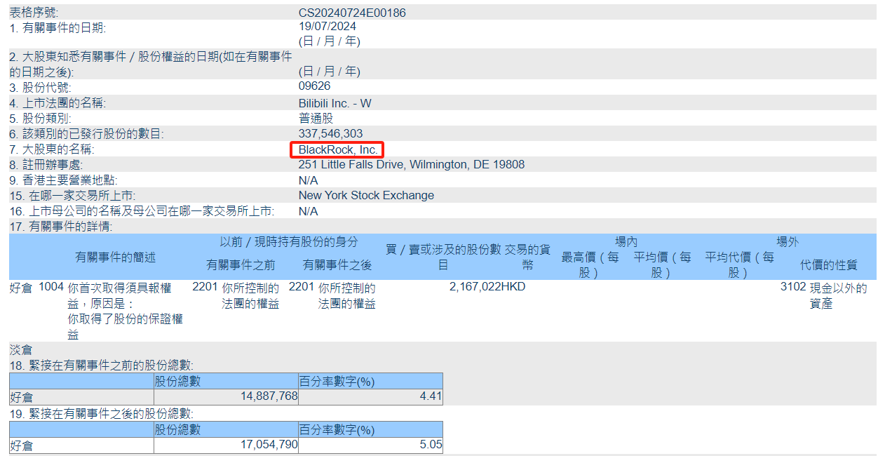哔哩哔哩:贝莱德持股比例从4.41%升至5.05%