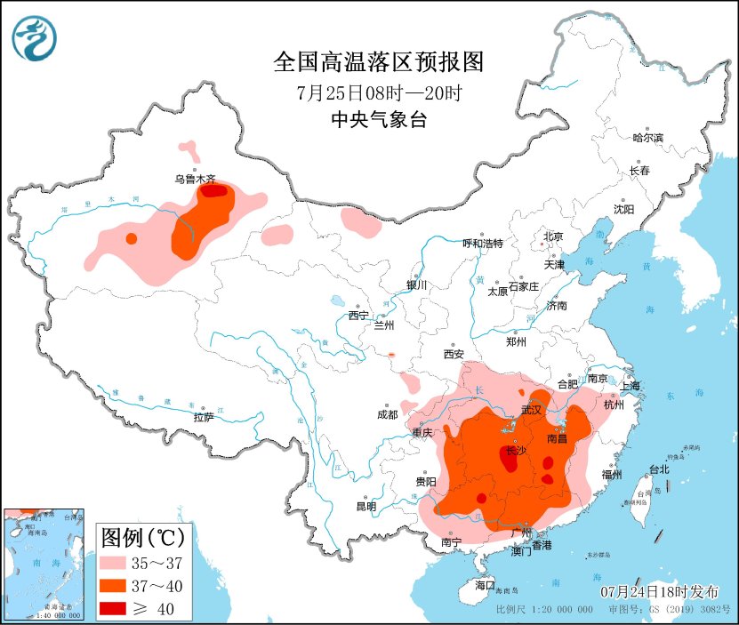 中央气象台7月24日18时继续发布高温橙色预警:预计7月25日白天,新疆南疆盆地东部、江汉、江淮中南部、江南、华南北部、西南地区东部等地有35℃以上高温天气,其中,新疆南疆盆地东部、江汉、江淮西部、江南、华南北部等地的部分地区最高气温37~39℃,江西中南部、湖南中部、新疆吐鲁番盆地等地局地可达40℃以上。