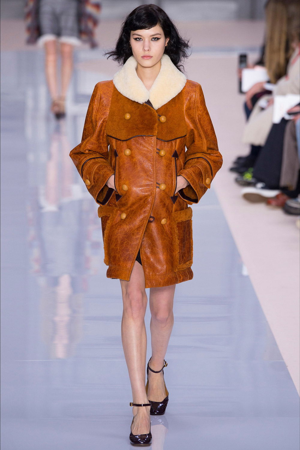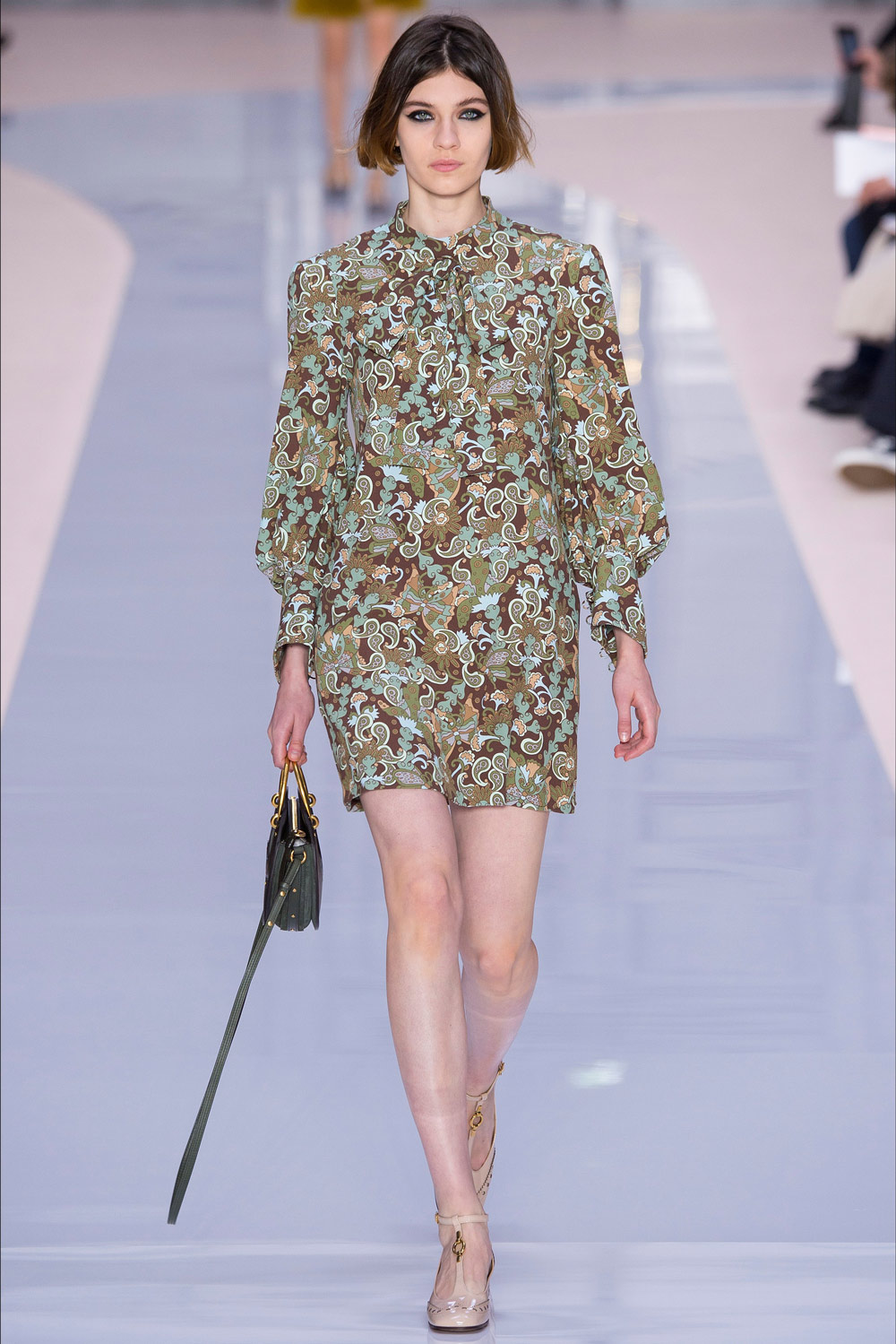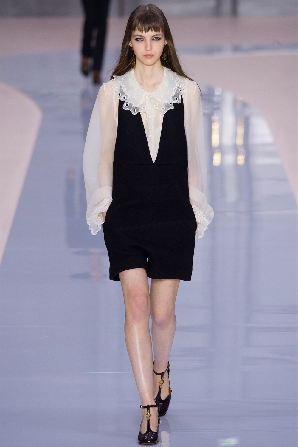 开秀的头一个造型——oversized大衣为整场发布定下基调,这季的Chloé大大咧咧。宽阔圆肩的金属双排扣短外套、方形衬衫风外套,曾经需要小鸟依人的女性形象突然转型成大姐头。就连模特眼妆也跟着变化——全包式眼线愈发浓重,眼尾部还带着向上飞扬的走势。
