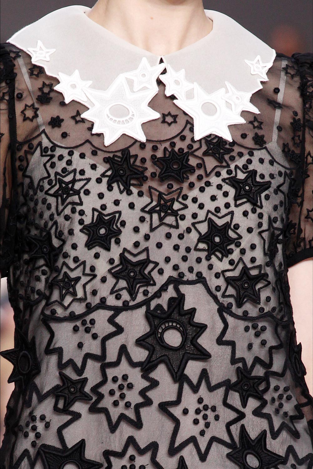 要说Chloé抛弃了原本的浪漫与温柔也有失公允,因为最新系列中不乏细腻婉约的印花、层叠的荷叶褶饰与飘逸的薄纱蝴蝶结。Clare Waight Keller在这一季里还用到了不少蝶翼形状的衣领,并饰有刺绣。压轴登场的连身裙索性印满了银河、繁星和女性侧颜,让人浮想联翩。