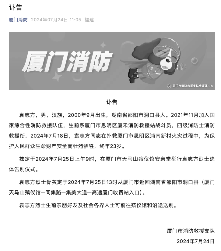 7月24日,厦门市消防救援支队发布讣告,袁志方,男,汉族,2000年9月出生,湖南省邵阳市洞口县人。2021年11月加入国家综合性消防救援队伍,生前系厦门市思明区厦禾消防救援站战斗员,四级消防士消防救援衔。2024年7月18日,袁志方同志在扑救厦门市思明区浦南新村火灾过程中,为保护人民群众生命财产安全而壮烈牺牲,终年23岁。