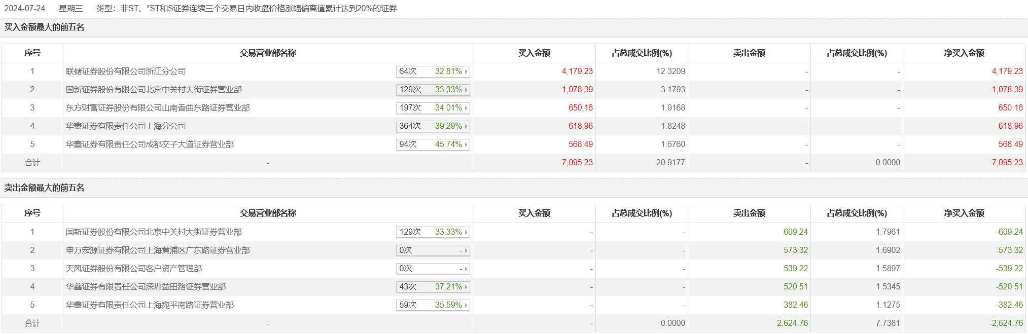 申通地铁7月24日涨停,龙虎榜数据显示,上榜营业部席位全天成交7683.85万元,占当日总成交金额比例为37.44%。其中,买入金额为5255.75万元,卖出金额为2428.1万元,合计净买入2827.65万元。