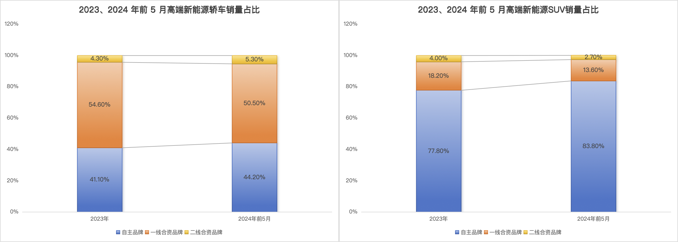 而在高端新能源轿车市场,2023-2024年前5月30万以上轿车销量约为99.3、36.3万辆,新能源渗透率仅为14.3%、10.3%,合资品牌在新能源市场占比超过50%并以油改电车型为主,自主品牌布局有限且相对蓝海。