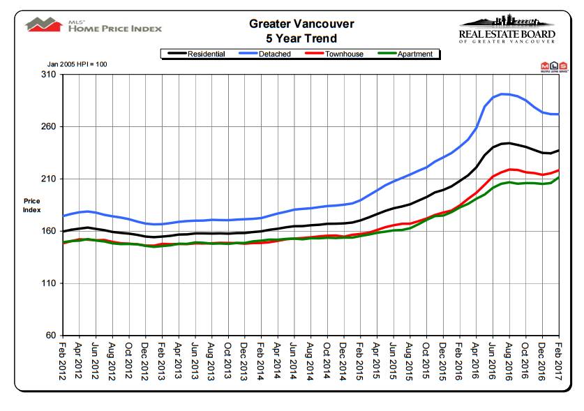 (大温地区过去五年房屋销售量对比图,2012年2月 - 2017年2月)