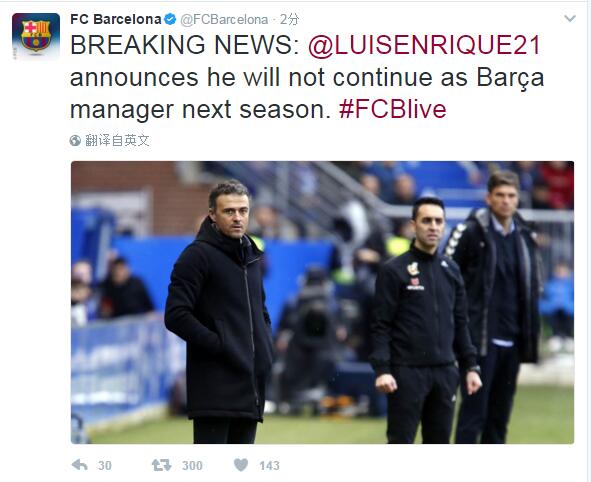 虽然这场大胜让巴萨暂时超越皇马升至积分榜榜首,卫冕冠军再次看到了争冠的希望,但在赛后的新闻发布会上却传出了一条比比赛本身更让人关注的消息:恩里克在本赛季结束后将不会继续担任巴萨主帅。