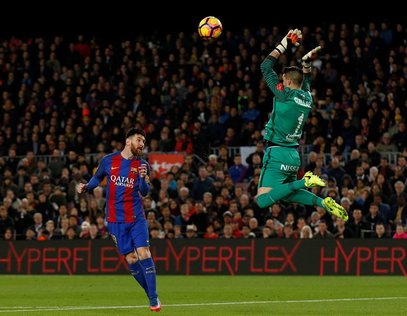 上半场开场仅仅8分多钟,马斯切拉诺送出长传,梅西反越位面对出击的奎利亚尔头球吊门得手,巴萨1-0领先。凭借这粒并不多见的头球进球,梅西也成为本赛季西甲联赛唯一能用左右脚与头球、点球、任意球都取得进球的球员。