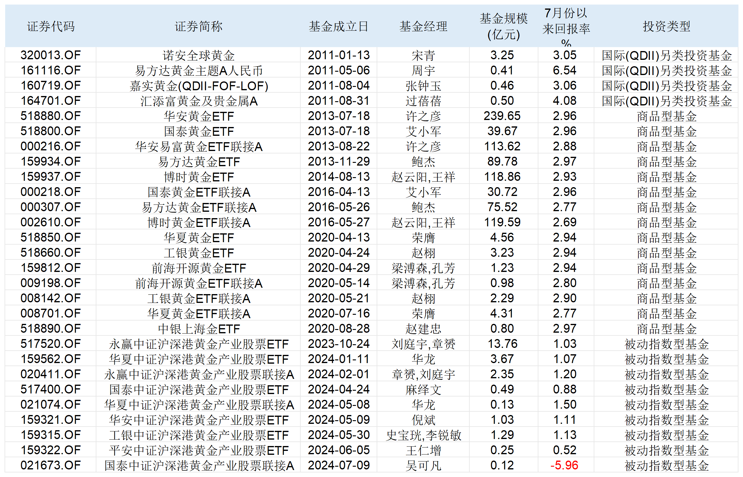从规模来看,华安黄金ETF规模最大为239.65亿元,仅7月份以来,该ETF的资产净值大涨10.43亿元,是市面上规模增加最多的一只产品。此外,博时黄金ETF及联接基金、华安易富黄金ETF联接基金均超过了100亿元。