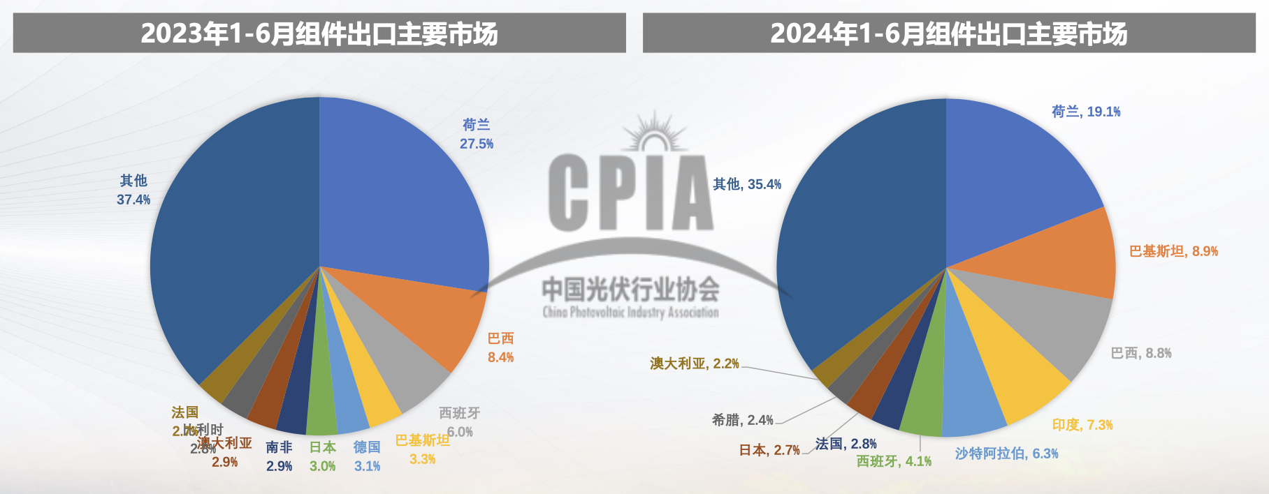 欧洲、亚洲市场合计占国内组件出口份额超过80%。欧洲依然是中国最大的组件出口市场,但市场份额由2023年同期的57.4%下降至42.5%。巴基斯坦成为上半年第二大组件出口市场,沙特阿拉伯市场增长明显,成为上半年前十大组件出口市场中的第五位。