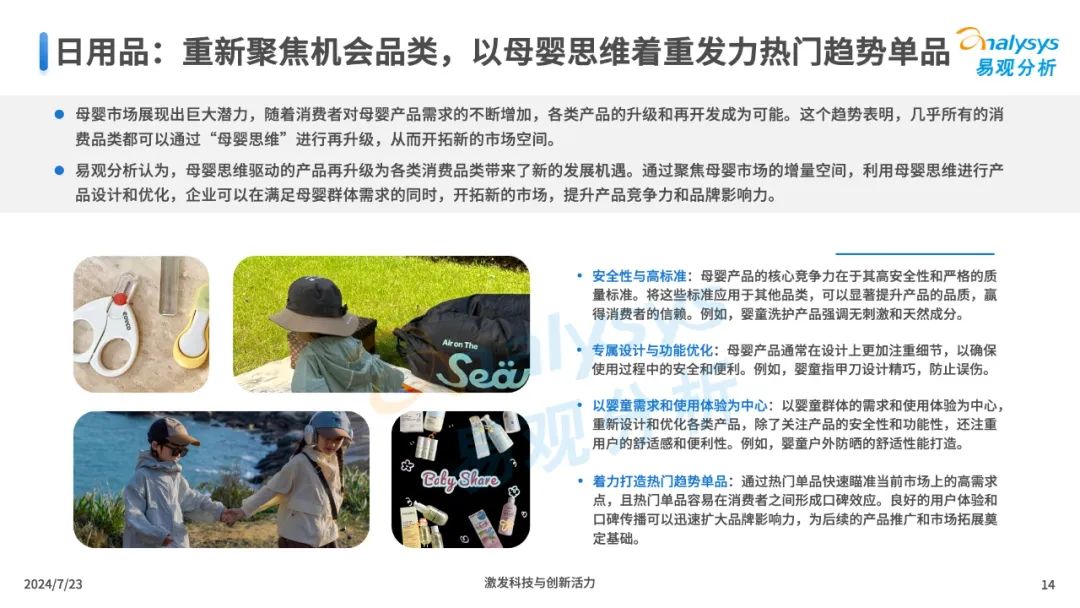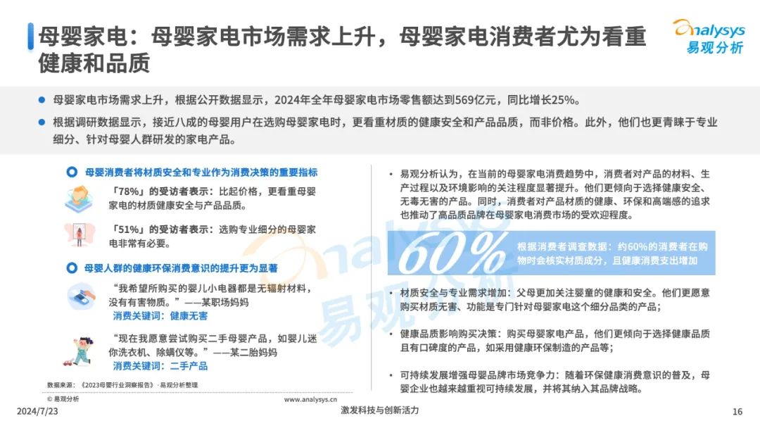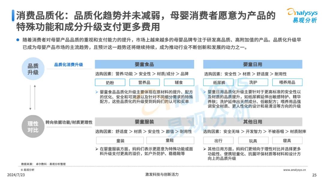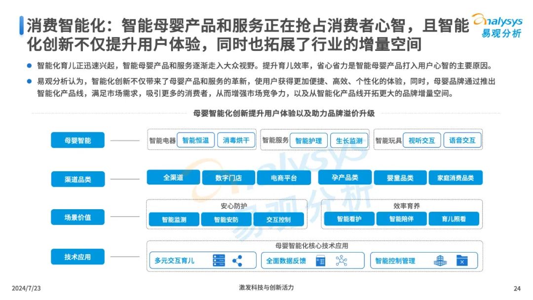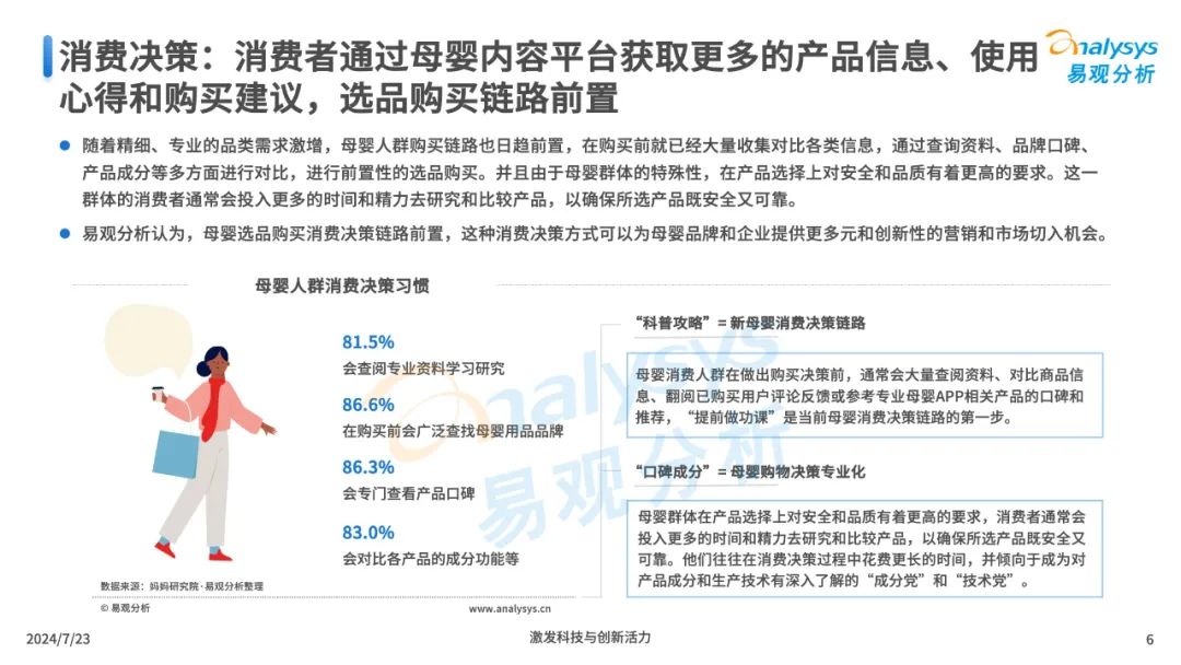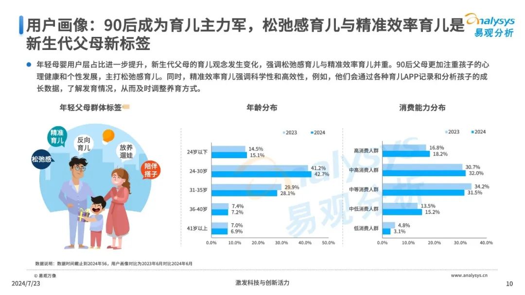 2024年,中国互联网母婴市场的增长活力主要来自于消费升级。随着消费者对优质母婴产品和服务需求的不断提升,市场整体发展势头强劲。同时,新一代父母在育儿过程中更加注重松弛和精准育儿。他们追求科学育儿理念,也希望育儿过程轻松高效,这些新标签也正在重新定义着母婴市场的用户需求。