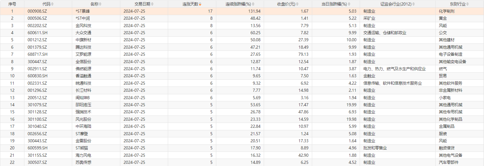 Choice数据统计,今日1只个股连续17天上涨,为*ST景峰;2只个股连续8天上涨,为金风科技、*ST中润;此外,大众交通、中旗新材等9只个股连续6天上涨;强瑞技术、风光股份等13只个股连续5天上涨。