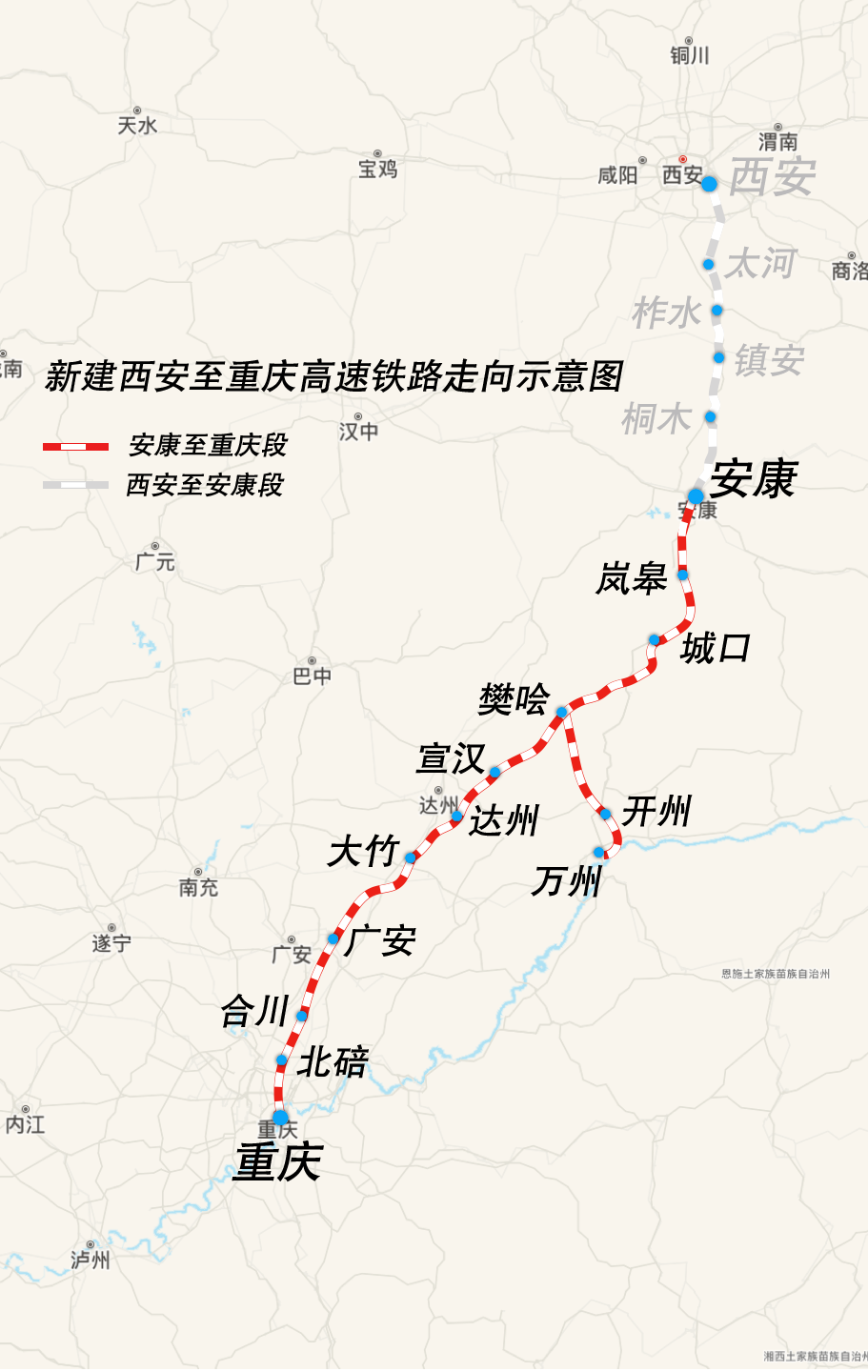 西渝高铁是我国“八纵八横”高铁网北京至昆明的京昆通道和包头、银川至海口的包(银)海通道的重要组成部分,路网地位十分重要。项目全长739公里,设计时速350公里,分西安至安康、安康至重庆两段建设,其中,安康至重庆段正线全长478公里,自安康西站起,经陕西省安康市,重庆市城口县,四川省达州市、广安市,重庆市合川区、北碚区,引入重庆枢纽重庆西站,共设11座车站。