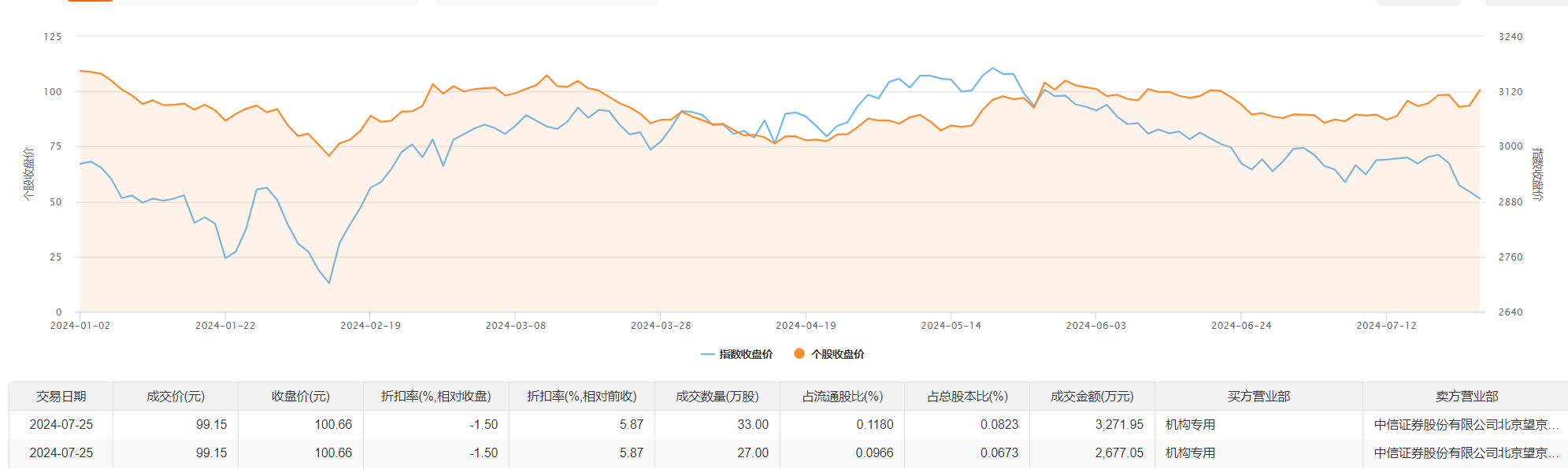 龙芯中科7月25日大宗交易成交60万股,成交额5949万元,占当日总成交额的8.49%,成交价99.15元,较市场收盘价100.66元折价1.5%。