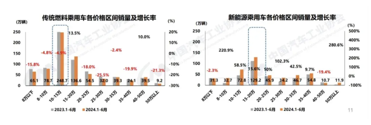 燃油车目前还能保持一定领先优势的,除了40万~50万元市场,就是20万元以下区域市场。15万~20万元市场将是下半年燃油车和新能源汽车纠缠的主要市场,不少以前20万元以上中级车价格下探,支撑起了这个市场的燃油车销量。