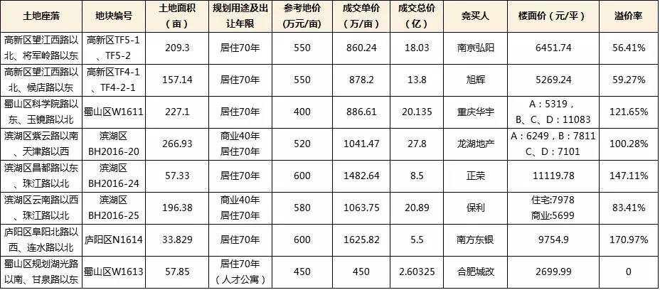 其中,高新区最低楼面价5269.24元/㎡;蜀山区最低楼面价5319元/㎡;滨湖最低楼面价7100元/㎡。
