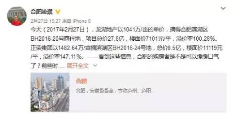 “看到今天这些土拍信息,合肥的购房者是不是可以缓缓口气了?前些时候那些在滨湖区高价拿地的开发企业是不是感觉压力山大了?”