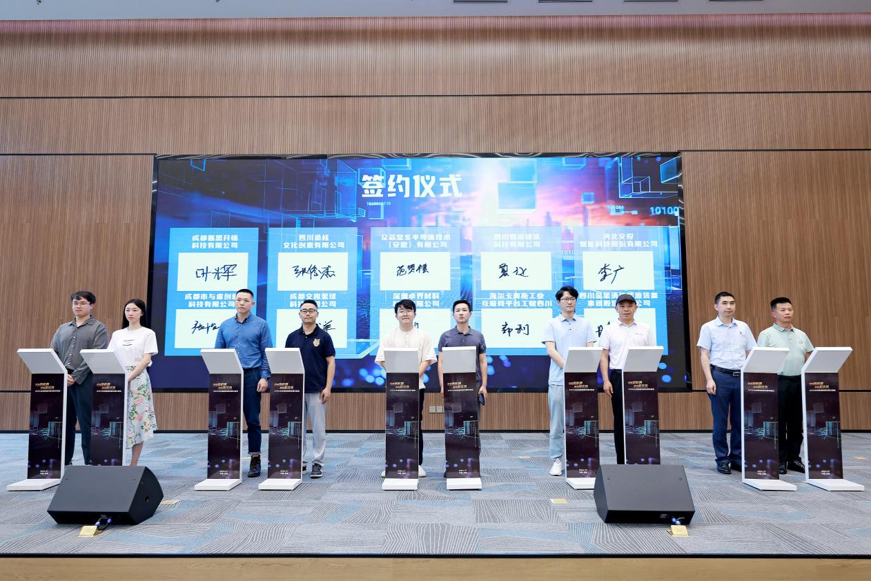 作为全链条产业合作的重大成果,10组重点项目签约也在活动上共同亮相,涉及签约总金额逾亿元。四川金星清洁能源装备集团股份有限公司与河北交投智能科技股份有限公司、海尔卡奥斯工业互联网平台与四川蜀道建筑科技有限公司等企业在现场完成了合作签约。