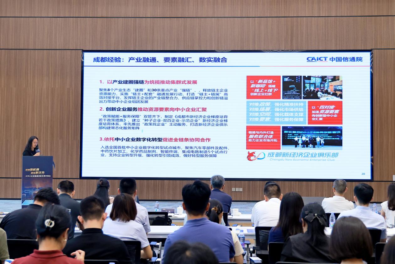 此外,她还介绍了由新经济发展研究院iNED与中国信通院产业与规划研究所联合开展的成都新经济领域大中小企业融通创新的案例研究,研究总结了以“产业融通、要素融汇、数实融合”推进大中小企业融通创新的成都经验,即以产业建圈强链为统揽推动集群式发展,创新企业梯度培育、搭建新经济企业俱乐部推动资源要素向中小企业汇聚,依托中小企业数字化转型促进全链条协同合作。她表示,期待成都在助力创新型中小企业发展工作上保持引领,提供更多可复制、可推广的先进经验。