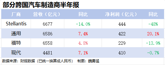 近日,多家头部跨国汽车制造商陆续公布今年的半年报,多数企业表现不及预期。福特、现代、Stellantis集团等公司股价在公布业绩后的首个交易日均遭受重挫,福特的单日跌幅更是高达18%,创十五年来最高。