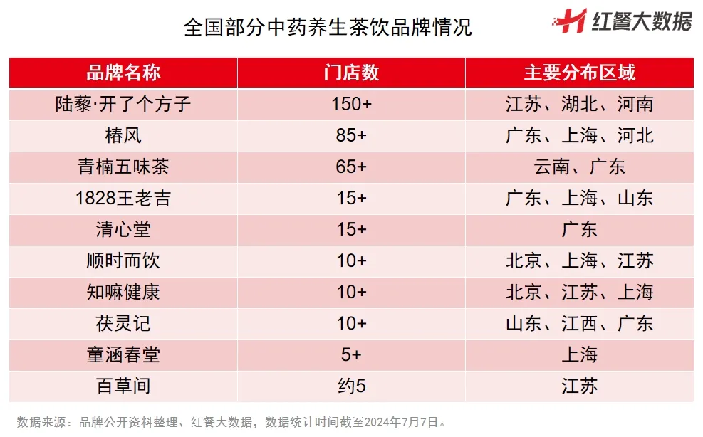 以新茶饮为例,据红餐网不完全统计,全国已有超30个主打中药或草本养生的茶饮品牌,如陆藜·开了个方子、青楠五味茶、椿风、知嘛健康、百草间等。
