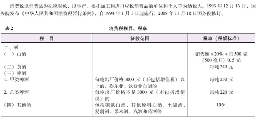 1993年12月,《中华人民共和国消费税暂行条例》发布,于1994年1月1日起施行。《条例》针对“酒及酒精”消费税的税目、税率(税额)规定为:粮食白酒消费税为25%、薯类白酒为15%。