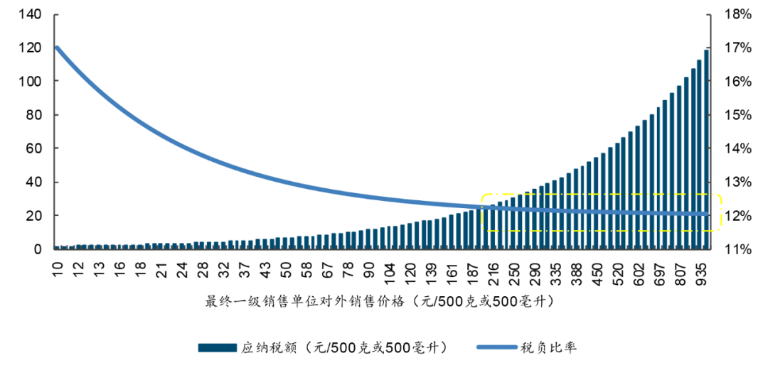 不同对外销售价格下白酒消费税应纳税额及税负比率(数据来源:国金证券研究所)