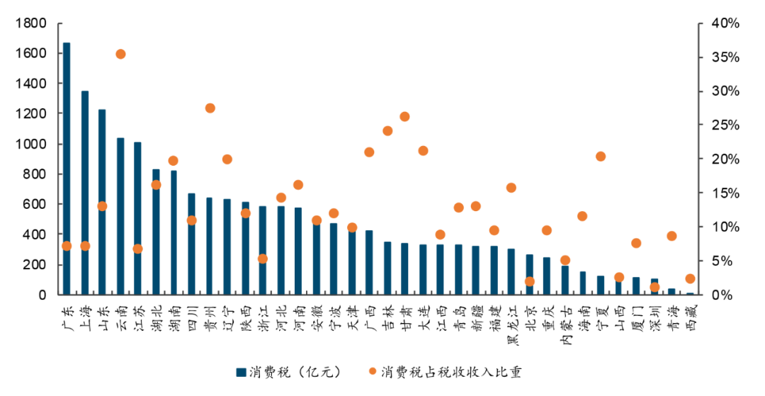2022 年地区消费税规模及占税收收入比重(数据来源:中国税务年鉴,国金证券研究所)