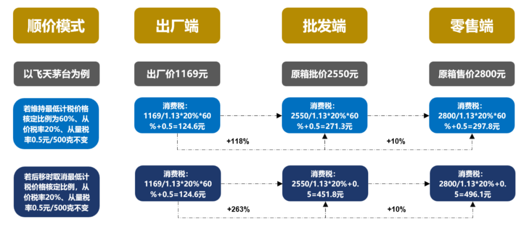 顺价模式下,以飞天茅台为例测算消费税负影响(数据来源:国金证券研究所)