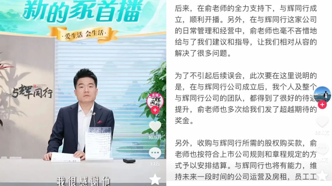 东方甄选CEO俞敏洪随后发布“致东方甄选股东朋友的一封公开信”,对与辉同行从东方甄选独立出去的前因后果进行说明。