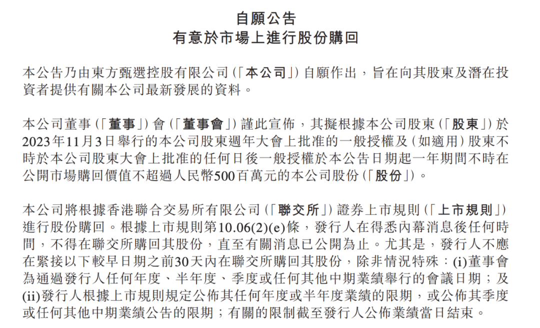 或许是为对冲董宇辉离职对公司股价的潜在影响,东方甄选还抛出了股份回购方案。公司公告称,一年期间不时在公开市场购回价值不超过5亿元的公司股份,并将在今天下午3点召开股东交流电话会,就上述事宜接受股东质询。