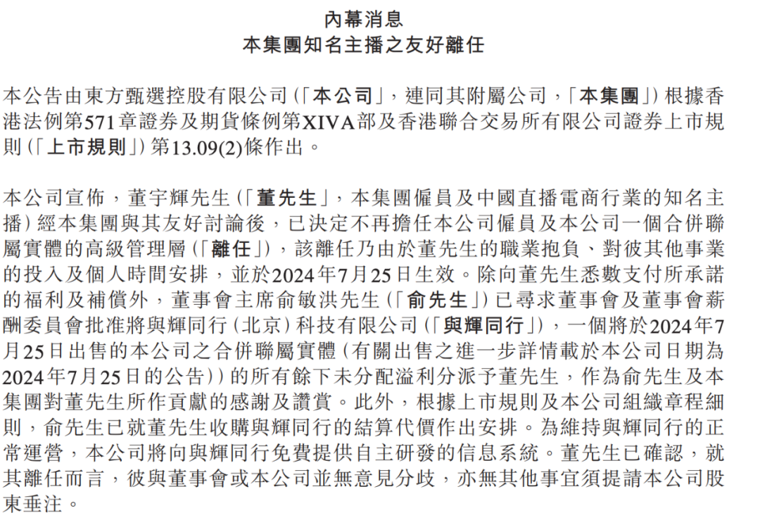 7月25日,东方甄选在港交所公告,董宇辉已决定不再担任公司雇员及公司一个合并联属实体的高级管理层,该离任乃由于董宇辉的职业抱负、对彼其他事业的投入及个人时间安排,并于2024年7月25日生效。