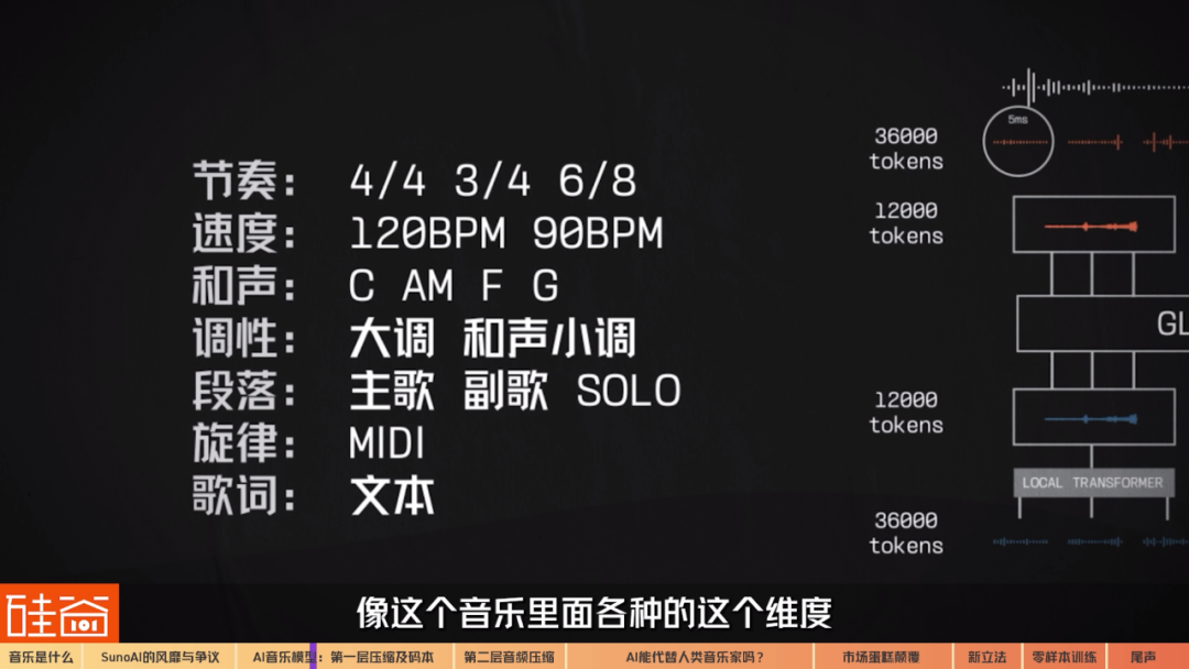 它可以把音频压缩很多很多倍。另外一项技术就是怎么样把各种各样被称为modelity(模态),比如说像这个文本,像这个音乐里面各种的维度,比如说像这个节拍是四四拍还是四三拍?它的速度 BPM 是120 还是90?或者说它的和弦进行这个 c major a minor 这样的进行调性。还有比如说它的这情感、流派、用的乐器,歌词音高,它的长度,还有歌手的风格都能够转成token。
