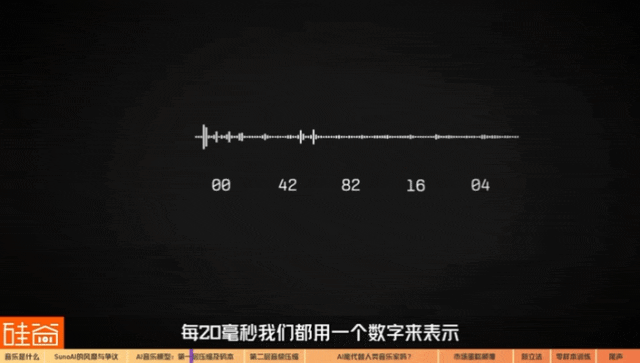 Roger ChenMeta音乐技术负责人20毫秒对于人来讲根本听不出来什么东西,就是Pia,Pia,Pia,可能全都是那样的声音,但是你把组合起来就是一个完整的音乐。每20毫秒我们都用一个数字来表示,像这20毫秒可能它是一个稍微安静一点的这种钢琴的声音,它的这个表示的数字就和一个比较吵的电吉拉声音会不一样,但是如果很相似的钢琴声音,它可能就用同一个数字表示。