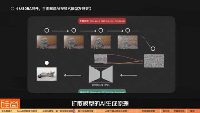 当时,AI生成音乐的普遍做法是把音频先转换成频谱frequency spectrum,就是这种图,然后再用图片的方式从扩散模型diffusion model去生成。扩散模型的AI生成原理我们在之前讲Sora视频生成的时候详细讲过,感兴趣的小伙伴可以去往回翻去看看那期。