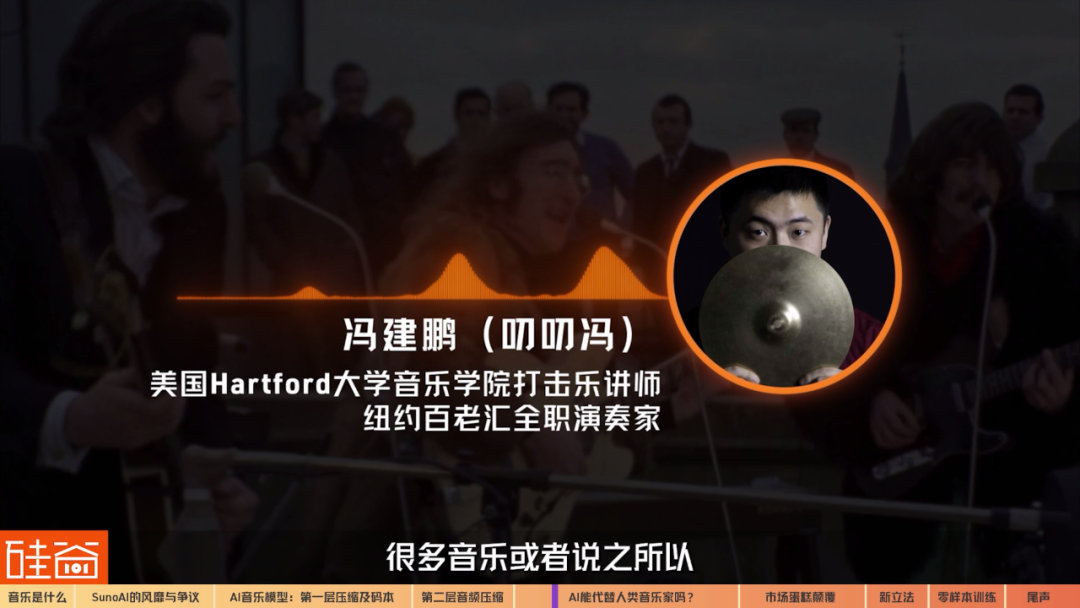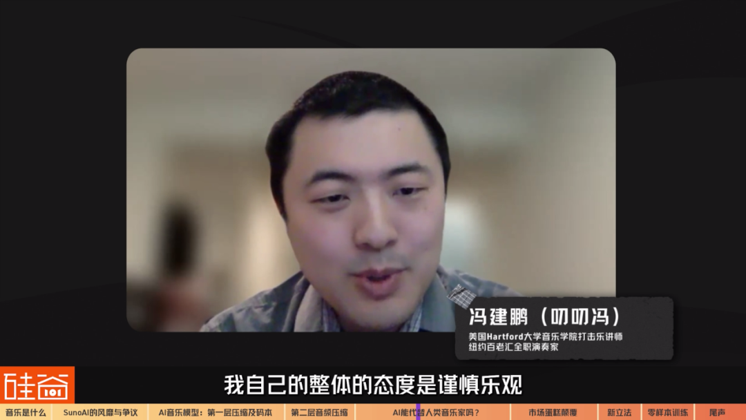 那么,Suno在专业音乐人眼中是如何的存在呢?能掀起什么风浪呢?我们采访了知名音乐博主“叨叨冯”,也是我自己很喜欢看的一个频道。叨叨原名是冯建鹏,是美国Hartford大学音乐学院打击乐讲师,也是纽约百老汇全职演奏家。他认为,AI目前可以达到音乐届的平均水平,但这样的平均水平,不足以在这个行业中出挑。