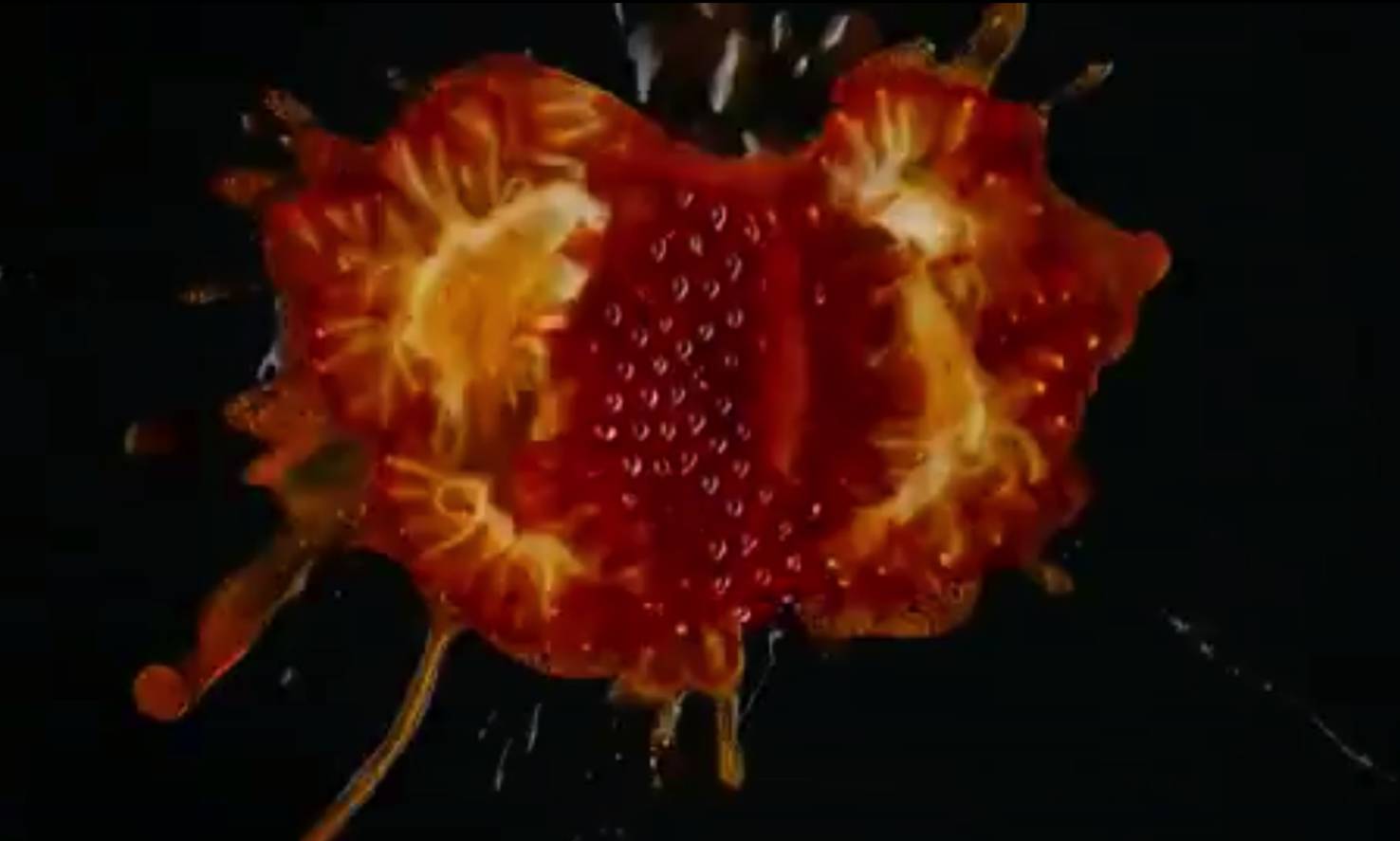 那么他们是怎么做的?制作组在拍摄这种场景时,会先将水果平放在一块玻璃上,然后用另一块玻璃从水果上方向下压,正上方的摄像头就会捕捉到水果在两块玻璃板间的爆裂场景。由于使用纯黑的桌布背景,所以从摄影画面上几乎察觉不到玻璃这一道具的存在。
