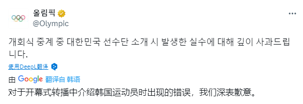 当地时间7月26日,巴黎奥运会开幕式中,现场播报员在韩国队出场时将国名念成了朝鲜。随后,国际奥委会在韩语官方账号致歉称,对在开幕式中介绍韩国运动员时出现的失误表示诚挚歉意。