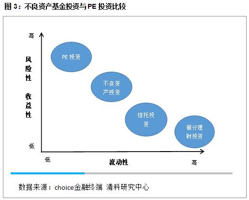 不良资产投资和 PE 投资的差异比较明显。首先,不良资产投资要求投资后很快回收现金,周期比私募股权投资要短;其次,不良资产投资市场对专业度的要求更高,成熟投资机构对风险的管理能力更强;再次,不良资产投资是逆周期投资,一般经济下行周期的底部是不良资产投资的黄金阶段;最后,在中国目前不良资产投资的发展还非常不充分,机构投资者刚刚开始配置相关类型的资产。相对来说,不良资产投资在收益性、风险流动性方面,相比其他主流理财产品有一定的优势。
