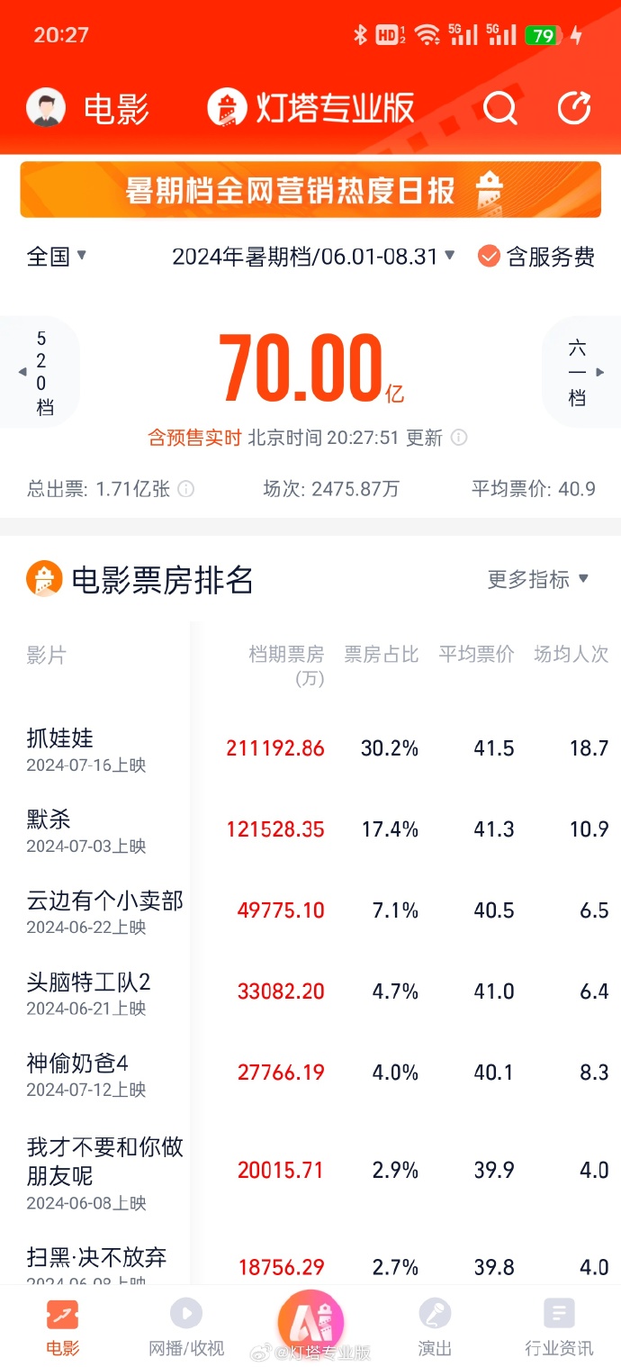 据灯塔专业版实时数据,截至7月27日20时27分,2024年暑期档(6月-8月)档期总票房(含预售)突破70亿元,《抓娃娃》《默杀》《云边有个小卖部》暂列档期票房榜前三位。