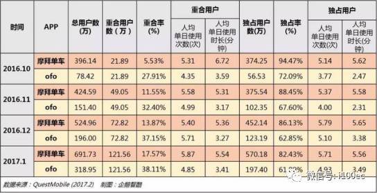 随着共享单车两强玩家渗透率的提高,二者的用户重合率也在增长。2016年10月已有超过21万用户是ofo和摩拜单车的双用户,11月增加至49.05万,12月达到72.82万,2017年1月达到了121.56万。