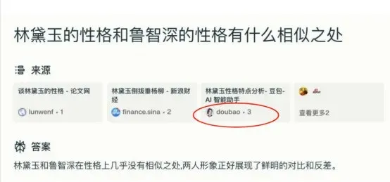 但这并没有打消作者和业界的疑虑。信奉实用主义的字节,此前就有过类似的“骚操作”。今年5月,豆包被爆出将AI自问自答的内容生成静态网页,利用搜索引擎提高排名曝光,从而吸引流量。比如,当有人问AI搜索软件Perplexity一个无厘头的问题:“林黛玉的性格和鲁智深的性格有什么相似之处”时,答案其中一个信息源,竟然是豆包和用户的聊天记录。