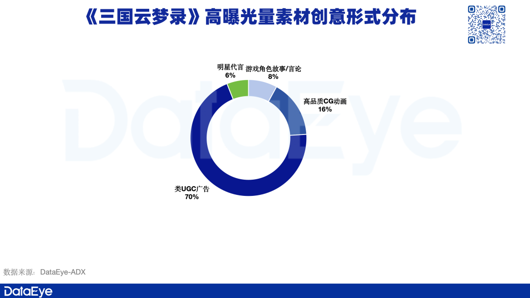DataEye-ADX海外版数据显示,《三国云梦录》高曝光量素材创意分布中,类UGC素材占比约为70%,其次则是高质量CG动画素材,占比约为16%,同时,游戏角色故事/言论以及明星代言类素材均有一定的占比。