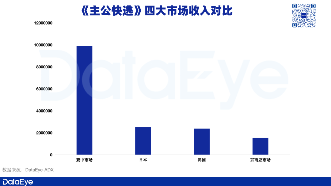 收入方面,点点数据显示,《主公快逃》上线之后,在海外市场的双端收入超1600万元,其中,繁中市场贡献了较多的收入,接近1000万元收入,而东南亚市场的收入占比最低,仅有153万的付费。