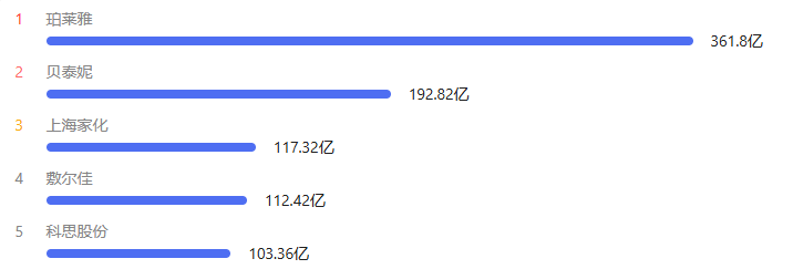 就7月24日的市值情况来看,化妆品上市企业中珀莱雅以361.8亿元人民币的市值位居第一,位居第二的贝泰妮市值达192.82亿元,第三的上海家化117.32亿元。