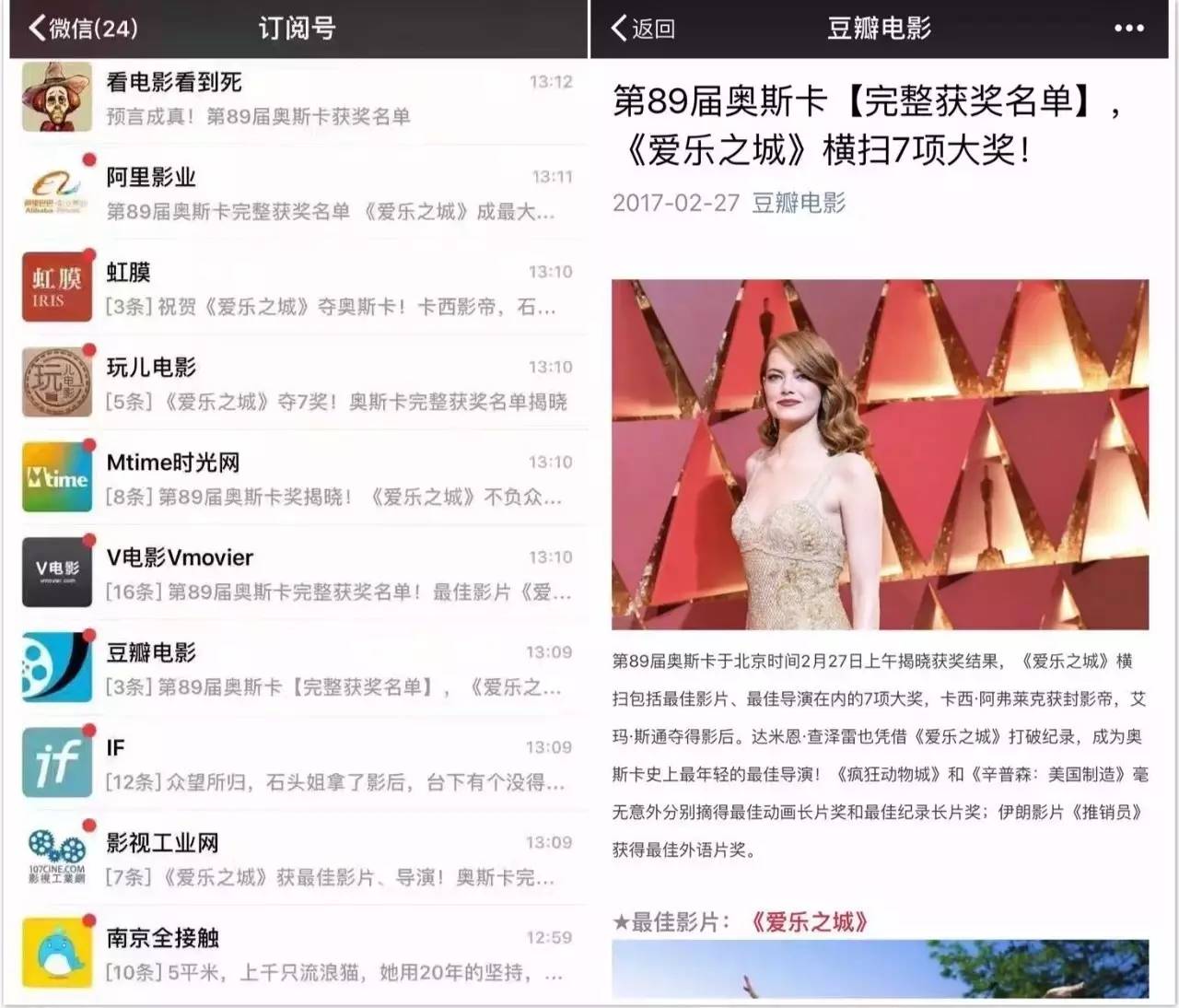 诚如这次的“奥斯卡乌龙事件”,我相信这些公众号的幕后团队一定做足了充分准备,谁当选,谁落选,为什么是它,这些获奖嘉宾背后又有着怎样的故事。在每一次重大热点事件的背后,这些奋斗在一线的自媒体总能够给网民单调的生活提供一些丰富的养料和谈资。