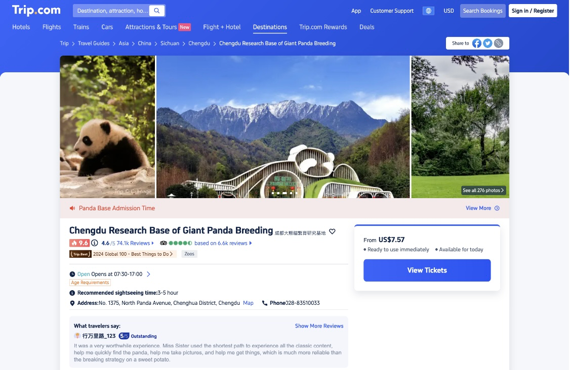 据了解,成都文旅集团旗下成都中青旅目前已在携程海外版Trip.com上架了「Chengdu City Tour」夜游锦官城、烟火芙蓉城一日游、天府古镇二日游、熊猫基地研学一日游等5条甄选入境游产品,“未来我们将依托携程大数据,精准锁定入境游客旅行偏好,持续为他们量身定制更多入境游文旅产品,覆盖大成都范围及周边重要文旅景区,希望以此为契机,向世界展示一个多元化、多层次的成都。”成都文旅集团董事长张海彤介绍到。据了解,携程海外版Trip.com服务英、日、韩、德、法等39个国家和地区的用户,提供24种语言的旅游预订服务,共有2500万外籍会员,平台日曝光量1500万人次。