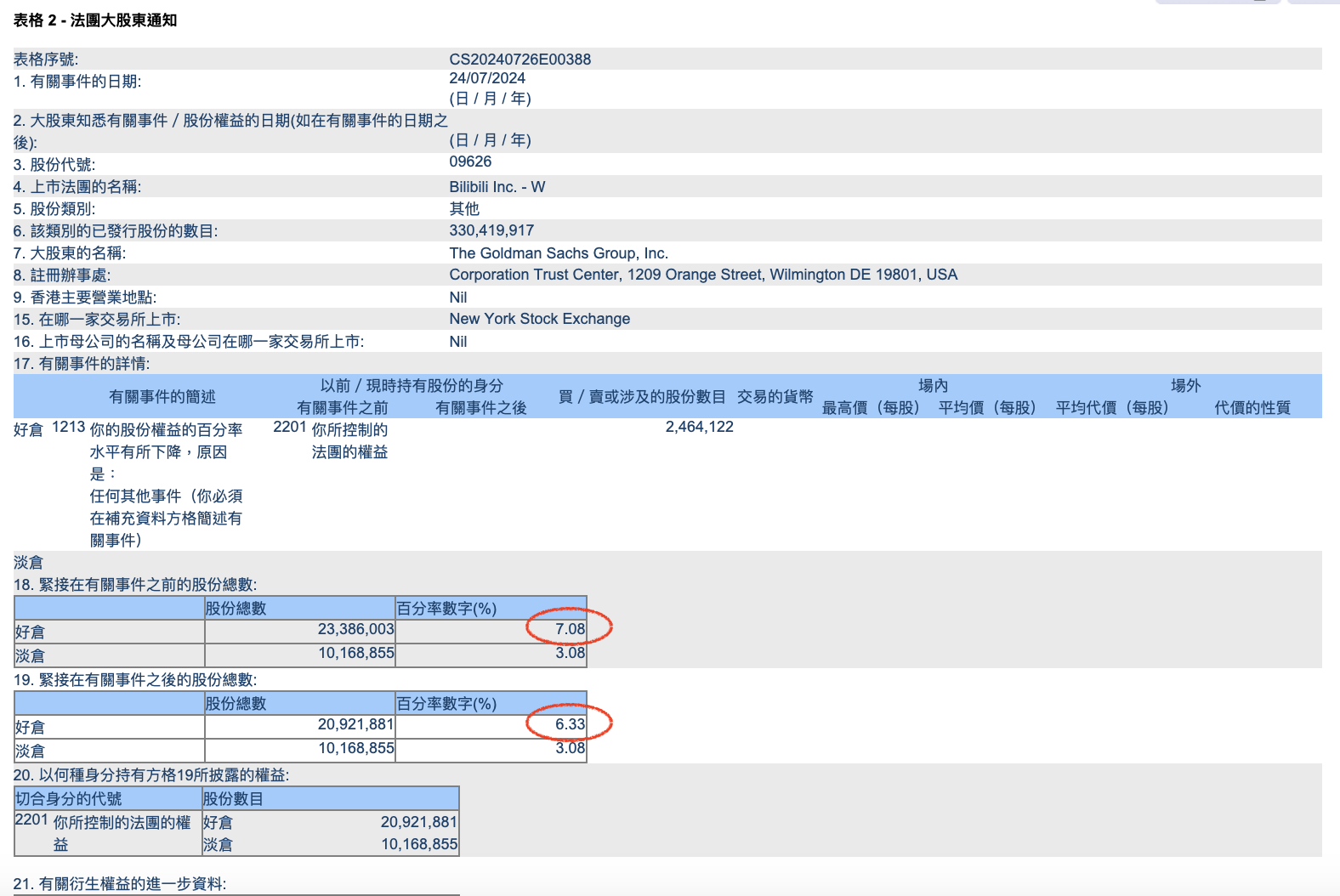 高盛对哔哩哔哩的多头持仓从7.08%下降至6.33%