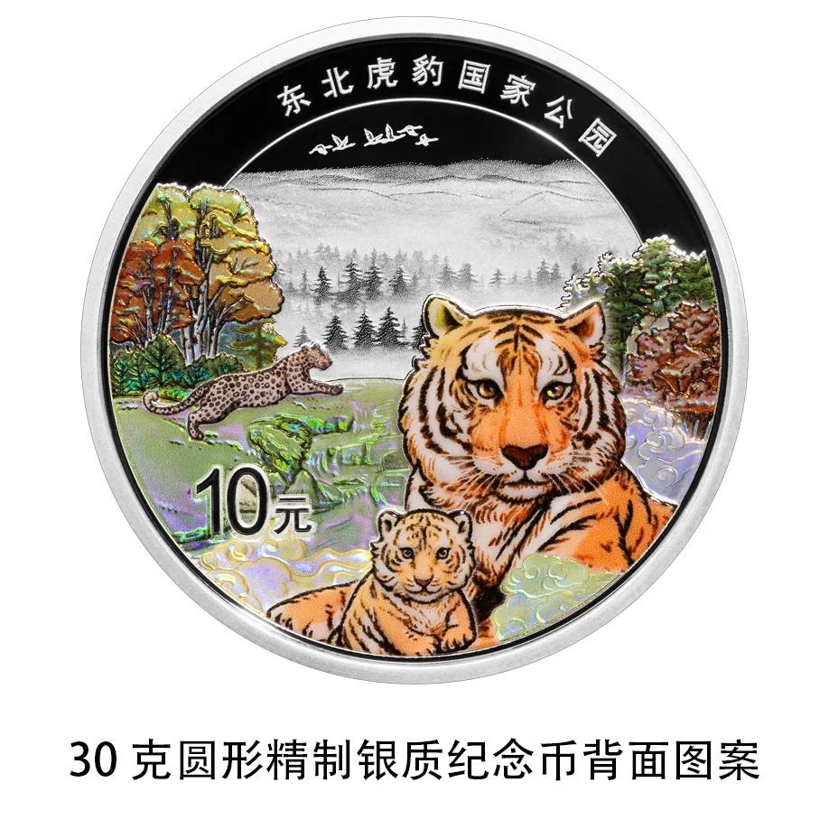 30克圆形银质纪念币背面图案为东北虎、东北豹、红松、白桦等元素装饰组合设计,并刊“东北虎豹国家公园”字样及面额。