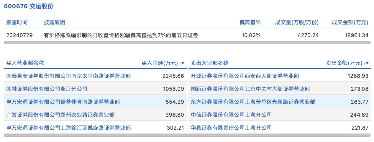 7月29日,交运股份今日涨停,龙虎榜数据显示,上榜营业部席位全天成交6830.58万元,占当日总成交金额比例为36.02%。其中,买入金额为4558.04万元,卖出金额为2272.54万元,合计净买入2285.5万元。