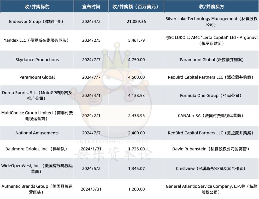 我们统计了2024年截至目前交易额最大的十笔收/并购交易。其中,有3笔交易与派拉蒙与天空之舞传媒(SKYDANCE Media)有关。从目前已披露的交易来看,全球娱乐行业的并购案集中在以下两个领域:
