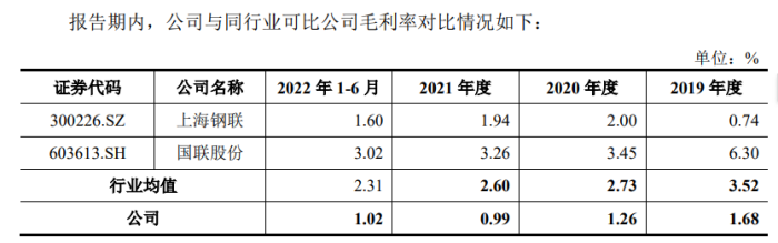 界面新闻注意到,欧冶云商毛利率不足2%,且远于行业均值。2019年-2022年上半年(报告期),公司毛利率分别为1.68%、1.26%、0.99%和1.02%,2019年-2021年呈逐年下降趋势,毛利率水平较低。